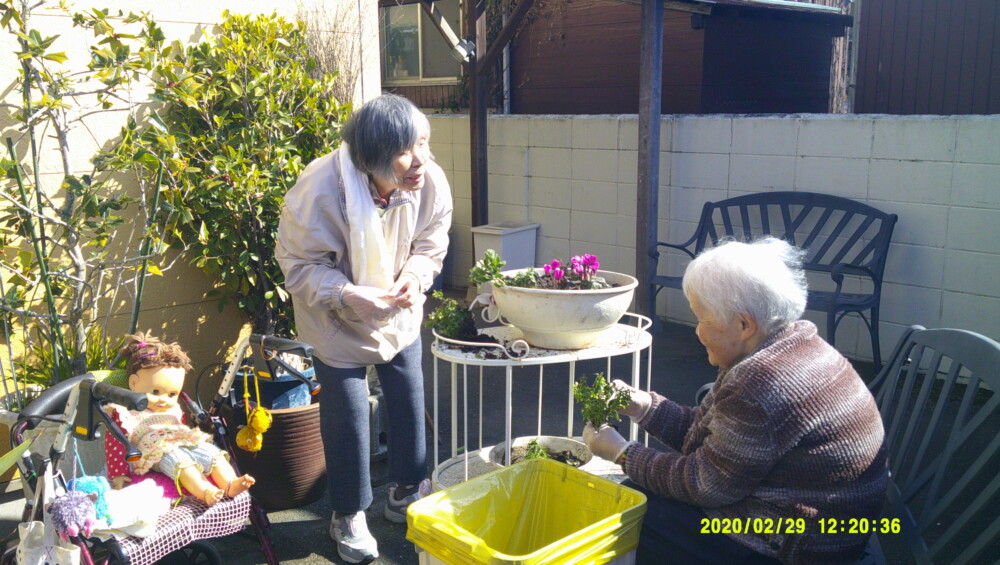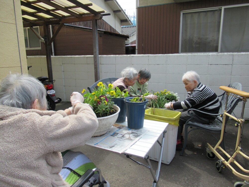 外でおやつを食べたり、花を植えたりして春を感じております